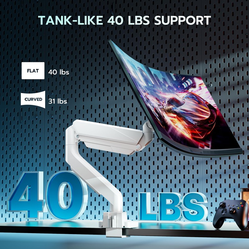 ARES WING Single Monitor Arm, Heavy Duty Adjustable Monitor Arm for 13"-45" Screens with USB, Gas Spring Desk Mount Stand with C Clamp/Grommet Mounting Base up to 40lbs Computer, White
