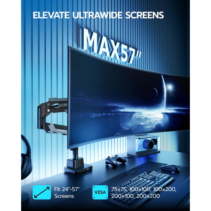 - 【Ultrawide Screen Compatibility】The monitor arm supports screens up to 57 ", including flat and curved displays weighing up to 52.8 lbs and 66 lbs. The included VESA adapters fits monitors with 75x75 mm, 100x100 mm, 100x200 mm, 200x100 mm and 200x200 mm VESA patterns. The monitor mount is built to handle ultrawide screens, compatible with the Samsung Odyssey G9, LG, and other ultra wide monitors