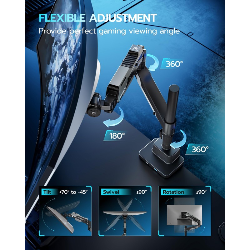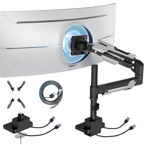 ARES WING Single Monitor Mount with USB, Ultrawide Monitor Arm for 24 to 57 Inch Heavy Duty Curved Screen, Adjustable Gas Spring Monitors Arm Stand up to 66LBS with 75/100/200 Vesa Mount, Black
