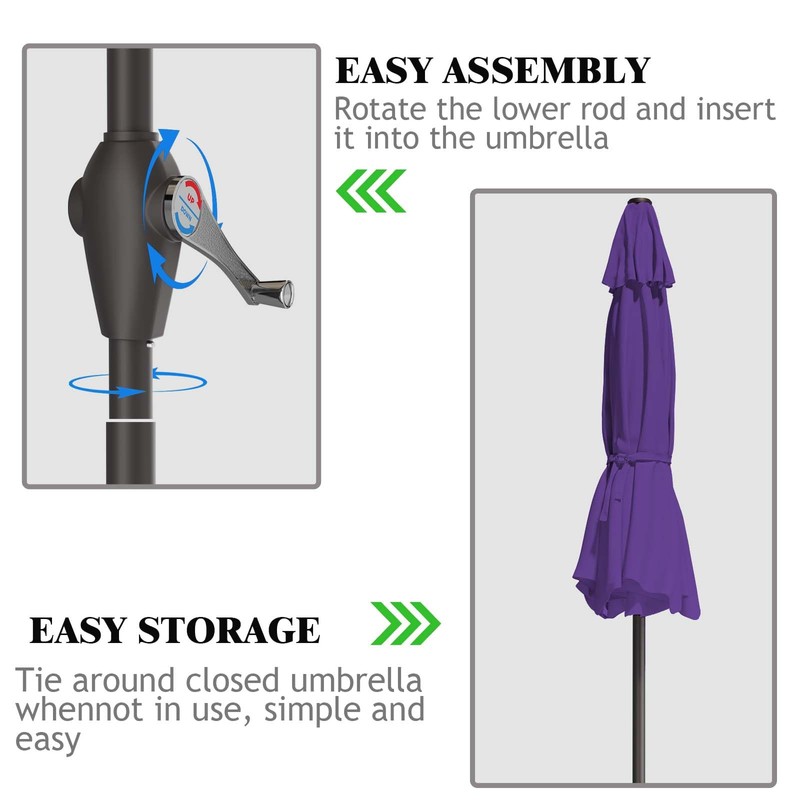 - CONVENIENT CRANK HANDLE - Adjusting the shade is simple with the crank-lift system. A few turns raises the canopy to the perfect height. Lowering is just as easy - no heavy lifting required. The tilt mechanism follows suit with an intuitive push-button design. A brief press angles the umbrella outdoor patio however you like. Find just the right shading whether seated or standing