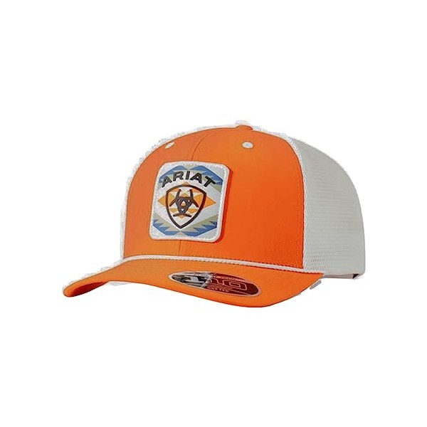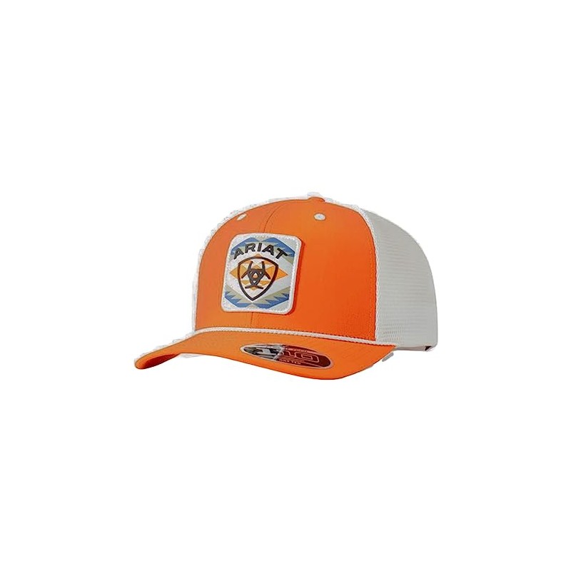 Stand out with this Ariat men's cap. The cap boasts orange front panels and a bill, complemented by a white mesh back. A patch on the front featuring the Ariat name, logo, and a Southwest design adds a pop of color and style. A snap back closure guarantees an ideal fit.