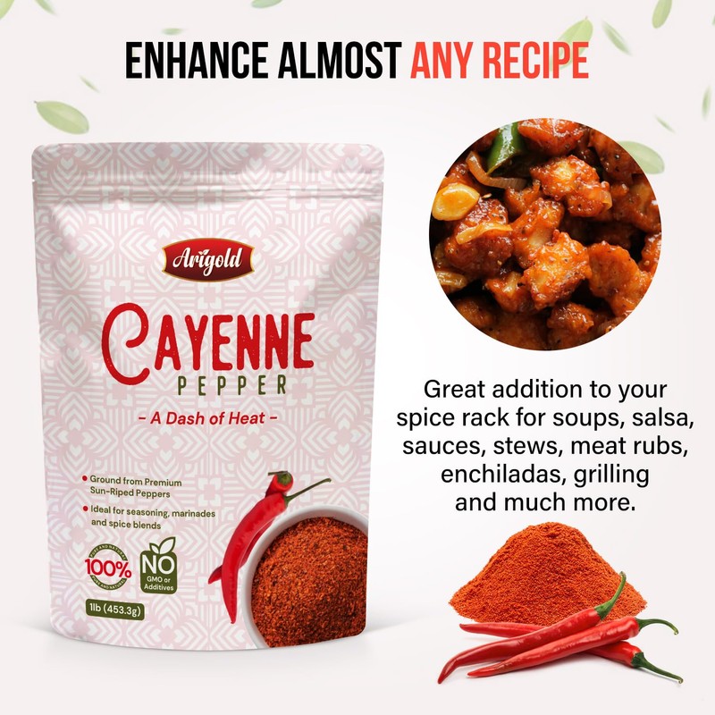 Arigold Pure Cayenne Pepper | 1 lb (453g) – All-Natural, Premium Ground Cayenne Pepper for Bold Flavor & Spice | chili powder | red pepper | spices and seasonings | Non-GMO | NON-irradiated | Resealable Bag. 16 oz
