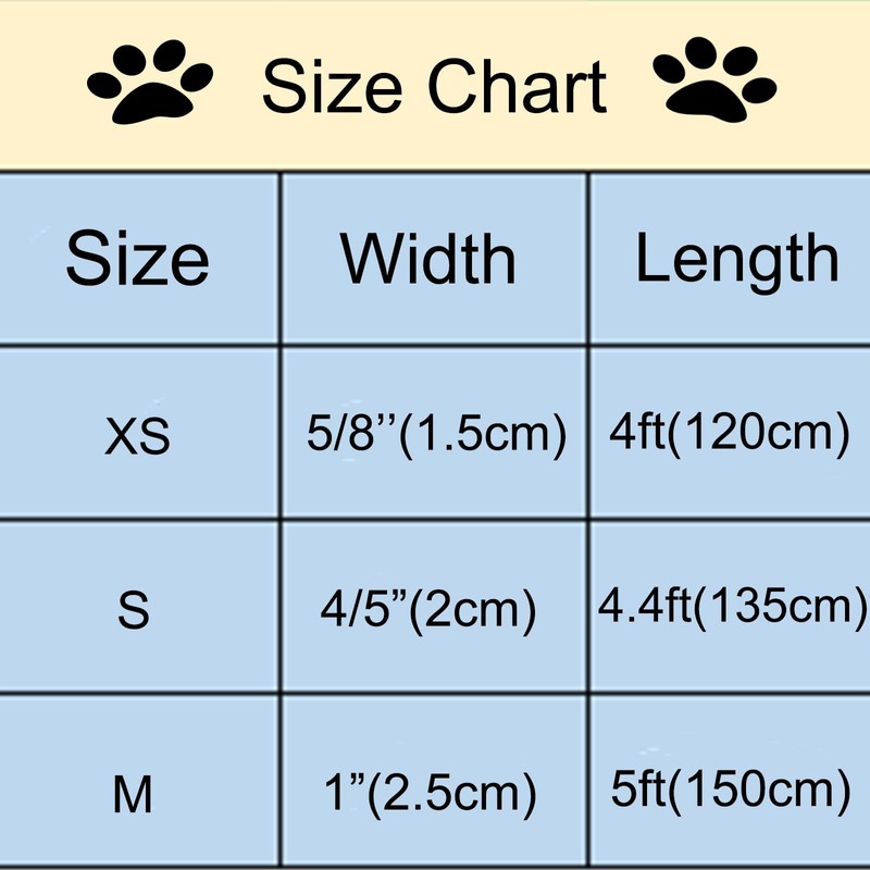 - SIZE❤XS dog leash Width: 5/8in(1.5cm), Length: 4ft(120cm). S dog leash Width:4/5in(2cm), Length: 4.4ft(135cm). M dog leash Width:1in(2.5cm), Length:5ft(150cm). M Leash is also suitable for L and XL dog collars
