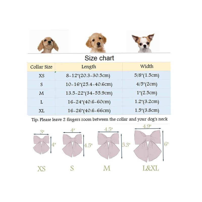X-Small: Collar(Width: 5/8", Length: 8-12"); Bowtie(Width: 3", Length:4" )