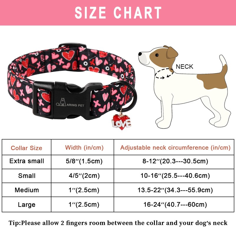 - HIGH QUALITY: ❤We focus on making high-quality pet products, and pay attention to the details of each valentine dog collar. We use high-quality plastic buckle, which are both good-looking and durable. ❤And easy to put on and take off. The valentine heart dog collar can be adjusted by roll buckle, D-ring can be used to hang a dog tag and attach to dog leash.