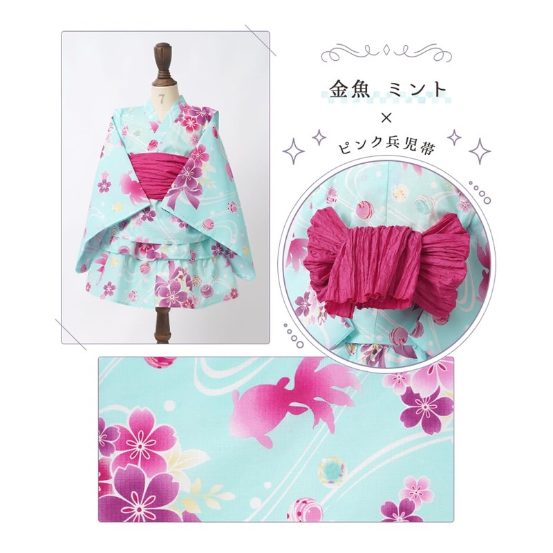 Arisana Yukata, Girls, Separate Children, 3-piece Set, Top, Skirt, and Waist Belt, Goldfish Mint