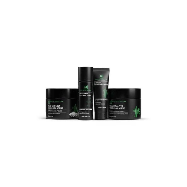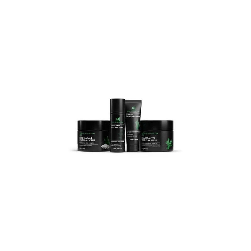 Give your skin the ultimate refresh with this targeted detox kit designed to fight oil, impurities, and buildup. Perfect for men with oily or congested skin, this set clears away dirt and toxins while restoring balance for a healthier, smoother complexion. What’s inside & why it works: Dead Sea Salt Charcoal Scrub – Gently exfoliates dead skin cells, unclogs pores, and smooths rough texture for a fresh start.Charcoal Detoxifying Cleanser – Removes deep-seated dirt, oil, and impurities without stripping natural moisture.Charcoal Tea Tree Clay Mask – Purifies the skin, controls excess oil, and helps prevent breakouts with antibacterial tea tree power.Witch Hazel Cool Men Toner – Tightens pores, reduces shine, and refreshes skin while restoring its natural balance.This powerful 4-step routine leaves your skin clean, refreshed, and energized—ready to take on the day. Benefits• GIVES YOUR SKIN A WEEKLY DEEP CLEAN• REMOVES IMPURITIES, EXCESS OIL, AND DEAD SKIN CELLS• FIGHTS, BREAKOUTS, AND CONTROLS SHINE• LEAVES SKIN FEELING SMOOTH, FRESH, AND DETOXIFIED• IDEAL FOR MEN WITH OILY OR ACNE-PRONE SKINHow to useDead Sea Salt Charcoal ScrubApply a proper amount to the wet face, wash it after massage, or use a towel or a wet towel to wipe it off directly. 1-2 times a week is recommended.Charcoal Detoxifying CleanserWet face and neck. Dispense product into hands and smooth over face and neck, massaging gently to loosen dirt and make-up. Rinse thoroughly with water.Charcoal Tea Tree Clay MaskAfter cleansing, apply a small amount evenly onto face. Leave for 15 to 20 minutes to dry completely and then gently remove and rinse face with warm water.Witch Hazel Cool Men TonerHold bottle several inches from face and spray a layer of mist on the face and neck, pat gently until absorbed.| Brand: | AristoGlow |