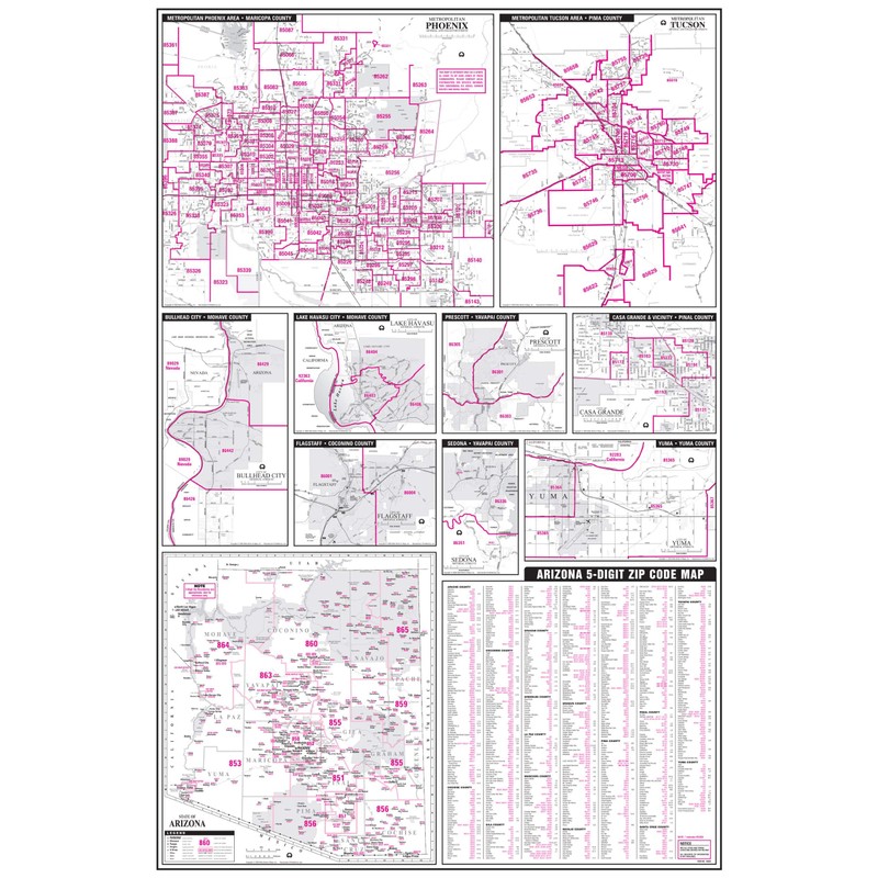 The Arizona 5-Digit ZIP Code Map Full-Size Dry Erase Ready-to-Hang Wall Map is updated to show the latest changes from the U.S. Postal Service. This statewide wall map is actually several maps in one. It includes a state road map that uses a pink overprint to clearly show 3-digit ZIP code divisions and 5-digit ZIP codes for single ZIP code communities. Multiple ZIP code communities have inset maps to clearly show 5-digit ZIP code divisions. These inset maps cover metropolitan Phoenix, metropolitan Tucson, Bullhead City, Lake Havasu City, Prescott, Casa Grande and vicinity, Flagstaff, Sedona, and Yuma. Also included is a comprehensive county/city ZIP code listing as a handy alphabetical reference. Use this wall map to quickly identify ZIP codes for multiple office tasks.