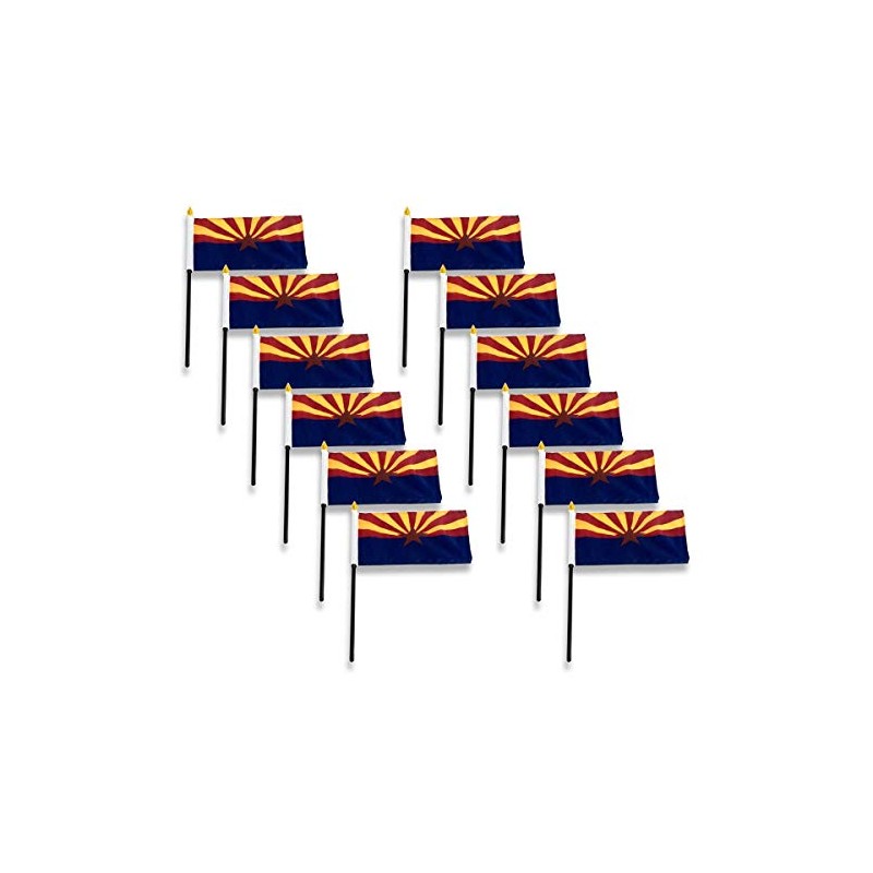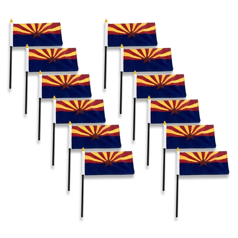 Arizona state stick flag 4 inch x 6 inch, mounted on a 10 inch plastic stick. Flag is made from polyester and printed in bright colors to make an attractive flag. Each flag is individually sewn around the edges. Available in 1, 3 or 12 Packs.