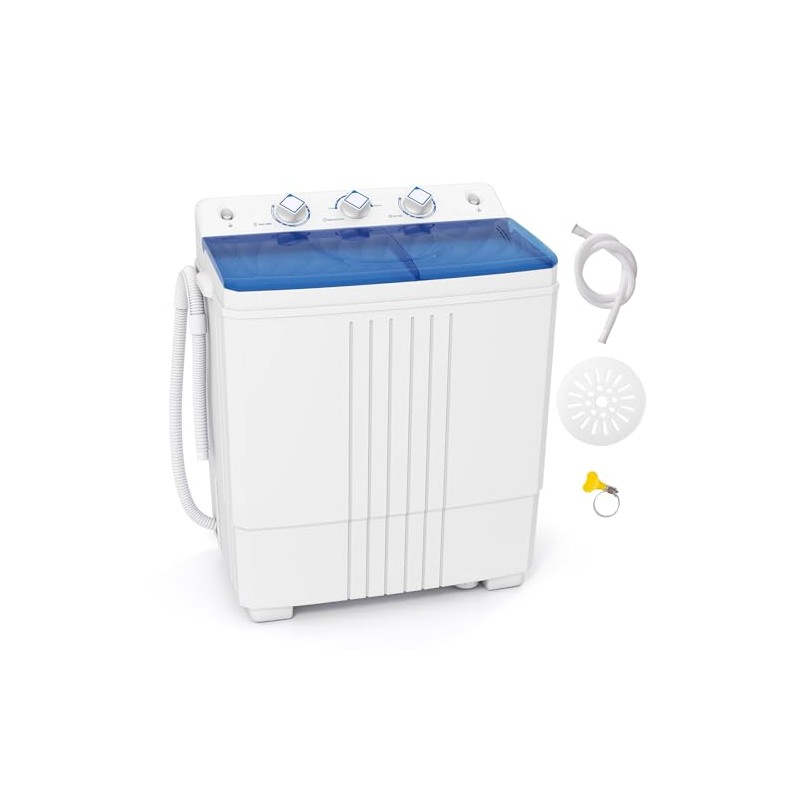 This compact twin tub laundry machine delivers powerful cleaning with a 260W washer and 140W spinner, enhanced by a spray rinse for spotless results. Designed for versatility, it handles up to 12 lbs of wash and 8 lbs of spin-dry, perfect for clothes, bedding, T-shirts, coats, pants, and more, while a built-in lint filter keeps fabrics clear of debris. The intuitive control panel lets you adjust wash and spin times to protect delicate fabrics. Gravity-assisted drainage ensures smooth water flow, complemented by a convenient drain hose bracket and cable organizer for easy setup. Its compact size is perfect for small spaces, like dorm rooms, RVs, or apartments. Its sturdy side handles enhance mobility, making laundry chores simpler wherever you are. More well-made details await your discovery.