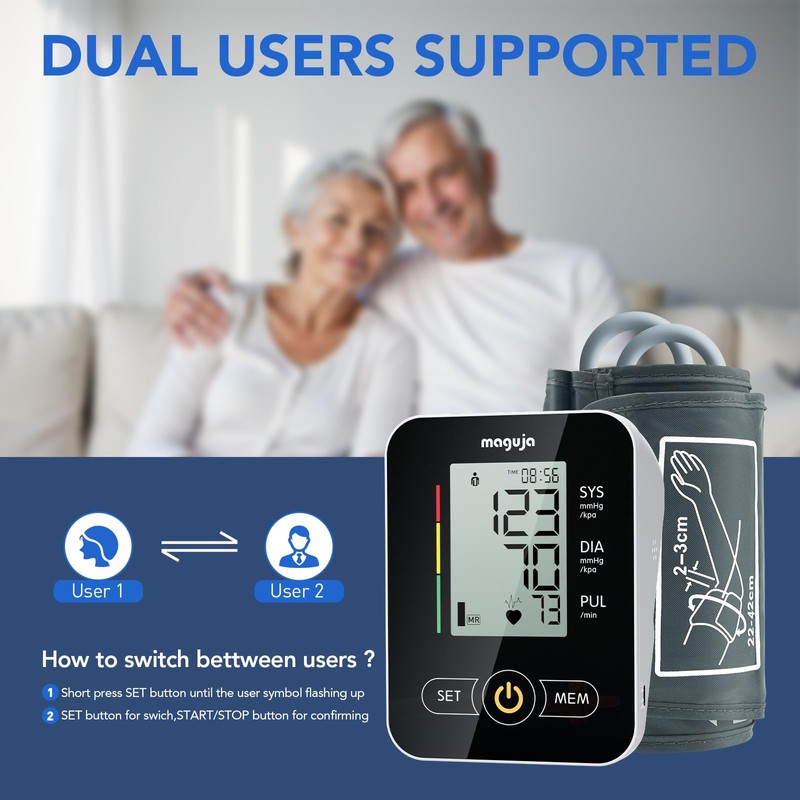 • Memory Function: This blood pressure cuff has the memory function of up to 120 measuring datas of 2 users, 60 records for each, which can save the data separately