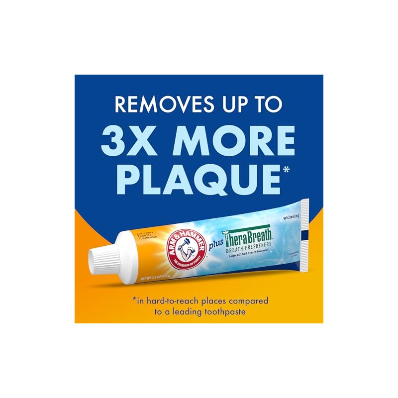 Get a confident smile and lasting freshness at an incredible value with ARM & HAMMER Toothpaste Plus TheraBreath Breath Fresheners, a teeth whitening toothpaste that gives you healthier teeth and gums while killing bad breath bacteria(1). This formula comes in Icy Mint flavor and contains TheraBreath Breath Fresheners, like those found in TheraBreath mouthwash, making it a great toothpaste to freshen breath. Naturally powered by ARM & HAMMER Baking Soda for effective whitening in a low-abrasion formula that’s gentle on enamel, this anticavity fluoride toothpaste targets plaque, tartar, and set-in stains. For a noticeably whiter, brighter smile and long-lasting fresh breath, brush with ARM & HAMMER Toothpaste Plus TheraBreath Breath Fresheners. (1) In laboratory tests (2) data on file (3) in hard-to-reach places compared to a leading toothpaste