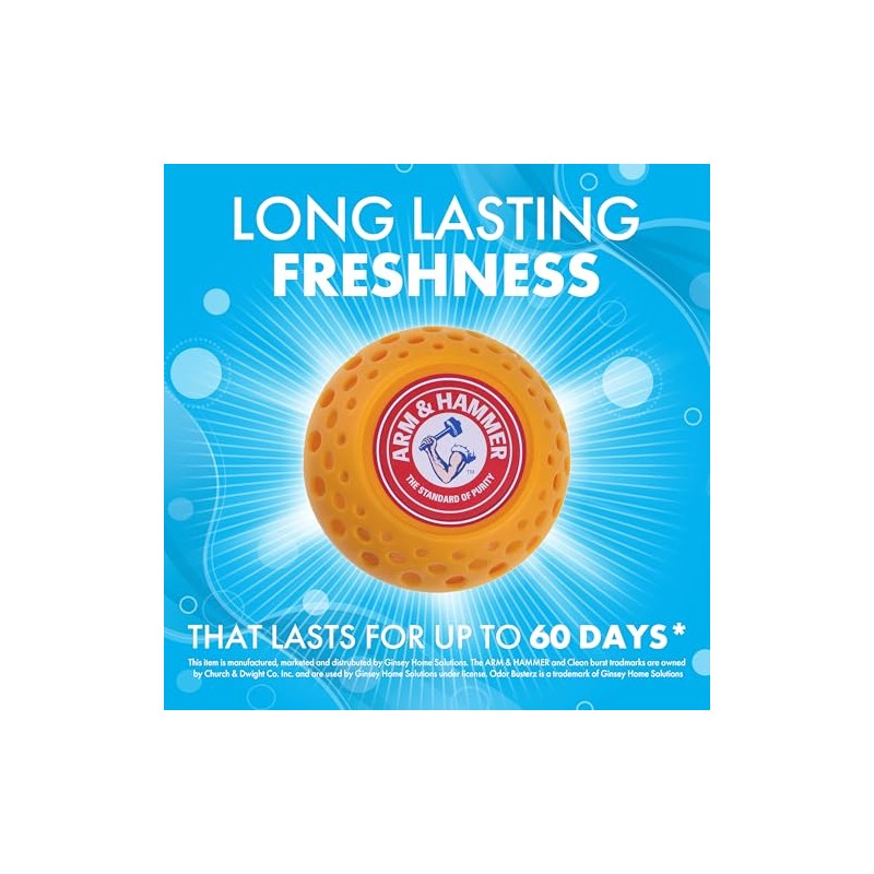 - FRESH BURST SCENT: Deodorizing balls filled with odor eliminating baking soda and Arm & Hammer fresh burst fresh scent.