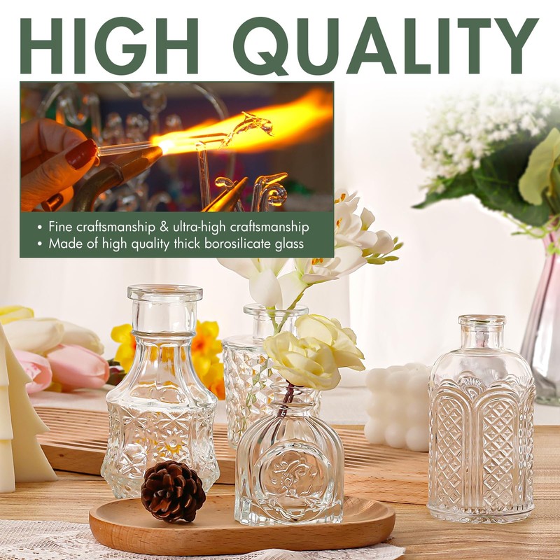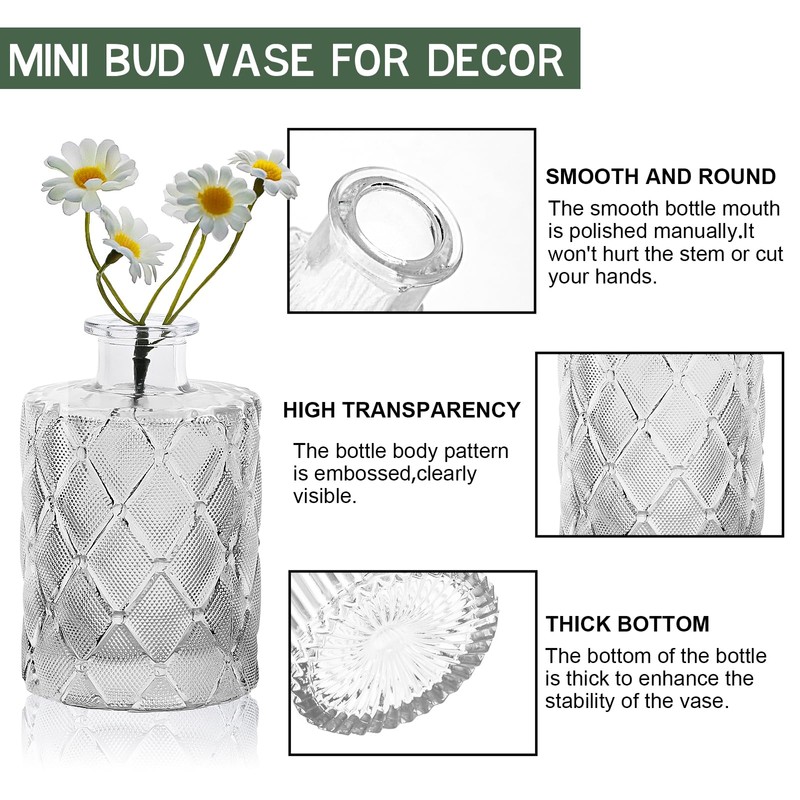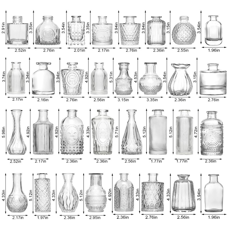 🌷【VARIOUS VINTAGE VASES】The package contains 45 delicate vintage clear vases in various sizes and dimensions, which can bring you multiple combinations! Each one is freshly textured and of high quality. The delicate vintage design can bring an unexpected visual feast to your decoration. 🌷【STRONG DURABLE GLASS】Each vase is made of selected high quality glass, durable, thick and crystal clear. The wedding centerpieces for tables is bubble-free and the surface is very smooth to the touch. Fill them with your favourite flowers to decorate your balcony or yard, when the sun shines, you will see the bouncing sunlight dancing on the glass! 🌷【WIDELY USED】The simple design of the small vase make it perfectly suited to a variety of colors and styles of flowers. If you want to decorate your room you can choose casual and simple flowers to fill these clear vases for flowers. If you want to decorate your wedding table you can choose romantic flowers with these small bud vases! Besides decoration, you can also fill these vintage small vases with essential oils and reed diffusers to enjoy your favorite fragrance. 🌷【TIPS】Vase colours may vary slightly due to differences in monitor settings and screen brightness, in order to guarantee your perfect shopping experience, please check the size and style of the vase carefully before purchasing. Although the vase has been firmly packed. However, due to the long distance, there may be damage caused by shipping, if you receive a broken vase, please contact us in time, we will refund or send a replacement for you. 🌷【SERVICE GUARANTEE】We always take product quality and service as our business philosophy, we believe you will love our small vase. If you have any questions about the vases, you can contact us at any time, we will certainly give you a satisfactory answer within 24 hours.