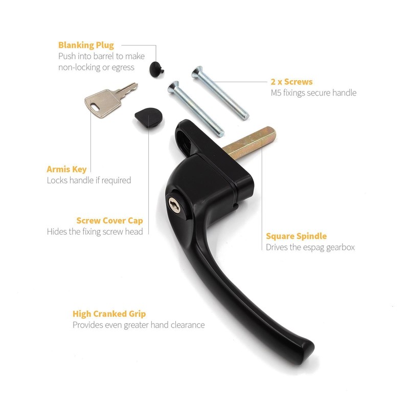 Durable key-locking cranked handles for espagnolette, uPVC windows. Combines premium appearance and exceptional build quality, whist remaining great value for money. Available for left or right-handed use in a choice of high quality finishes.