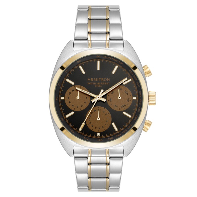 - Black sunray dial with day, date, and 24 hour subdials; gold-tone luminous hands and markers; printed outer minute tracker