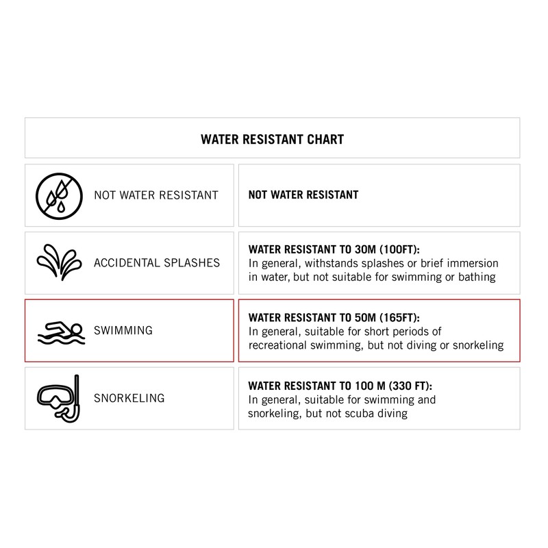 - Water resistant to 100m (330ft): in general, suitable for swimming and snorkeling, but not diving