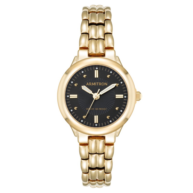 • Black textured dial with gold-tone luminous hands, markers and outer minute track