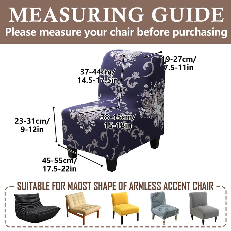 - Universal Slipper Chair Cover:Designed with stretchable borders,this Slipper Chair Slipcover fits a variety of armless chairs.Back height(above seat):37-44cm/14.5-17.5inch,back thickness:19-27cm/7.5-11inch,seat length:45-55cm/17.5-22inch,seat width:38-45cm/15-18inch,seat thickness:23-31cm/9-12inch.Please check the measurement guide in the item picture before order