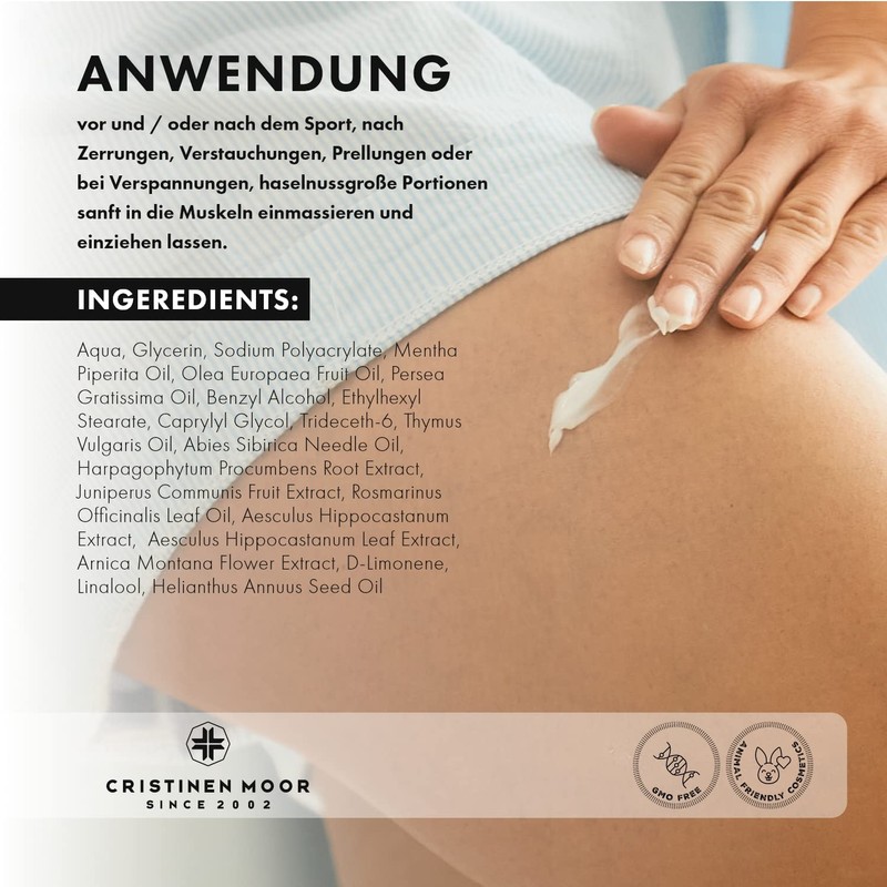 The CristinenMoor Sports Balm Revital contains natural ingredients, is free from synthetic colours and fragrances, parabens and mineral oil. It has been developed and manufactured in Germany and is therefore a high-quality fitness accessory you can rely on.