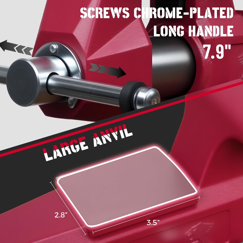 - Rustproof Finish with High Visibility: The red finish fights corrosion and ensures this vise is visible and accessible, even in cluttered garage environments
