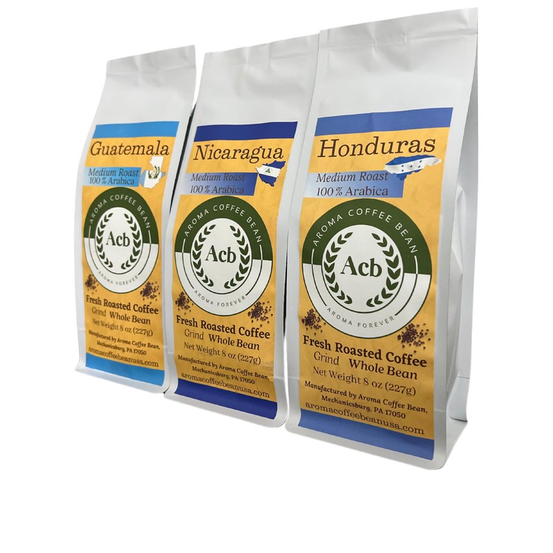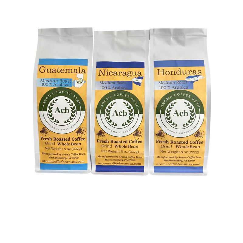 - Three Variety Pack Of Top Central American Coffee In 8 oz bag each (Honduras, Guatemala, Nicaragua) with gift box.