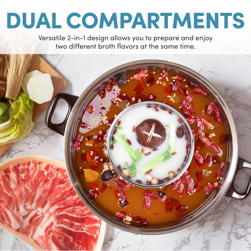 • Dual Compartments – The dual-pot bowl allows for two different types of soup to be cooked simultaneously. Do you have a family of heat-chasers, but prefer a nice, mild soup? This is the perfect solution. The revolutionary design allows both to be heated without fear of one spilling into the other.