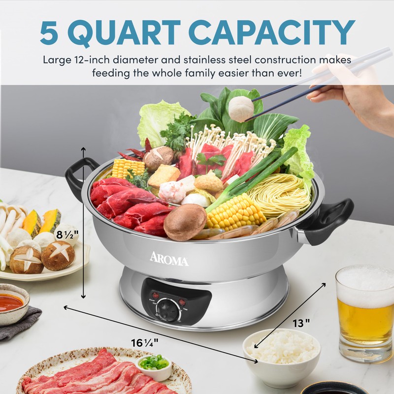 Aroma Stainless Steel Hot Pot, Silver (ASP-600), 5 quart