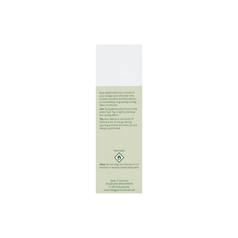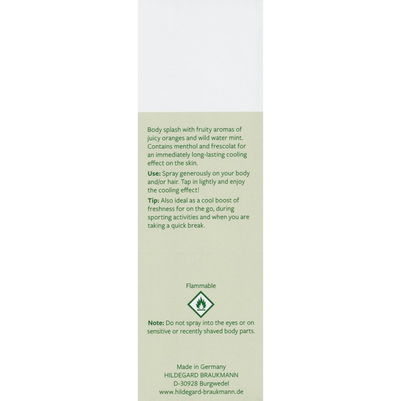 - Body splash with the fruity scent of juicy oranges and wild watermint. Contains menthol and frescolate for an instant and long-lasting cooling effect on the skin