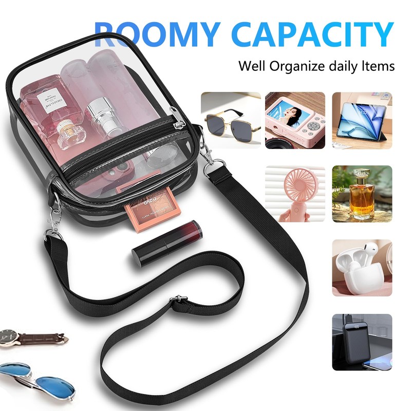 - [Clear Bag for Stadium Events] clear crossbody bag Size 8.8"H x 6.8"L x 2.1"W, complies with the clear bag policy of no larger than 12*12*6 inches, for public safety, more and more public places begin to implement clear bags policies across the country, can easily and quickly go through security lines, suitable for stadiums, concerts and sporting events.