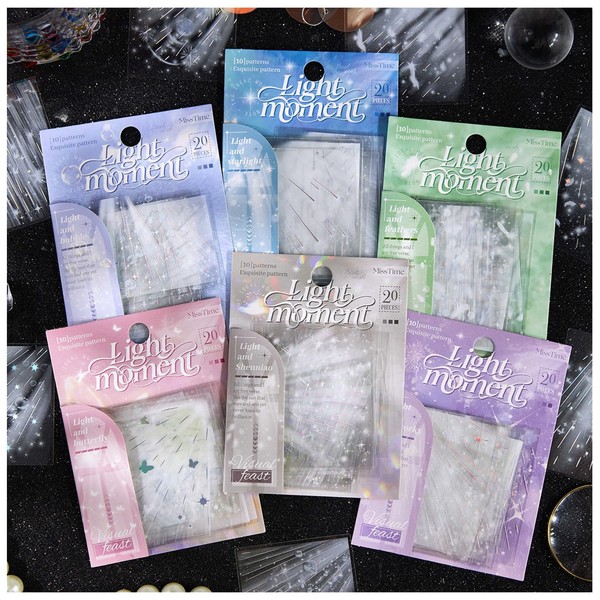- オーロラホログラムのシールセットです。きらびやかなスポットライト効果は夢のように美しくて素敵です。クリアベースなので、どんなお色の紙に貼っても合いますし、ポイントになるデザインになっております。ほかのコラージュ素材と組み合わせしてもおすすめです。
