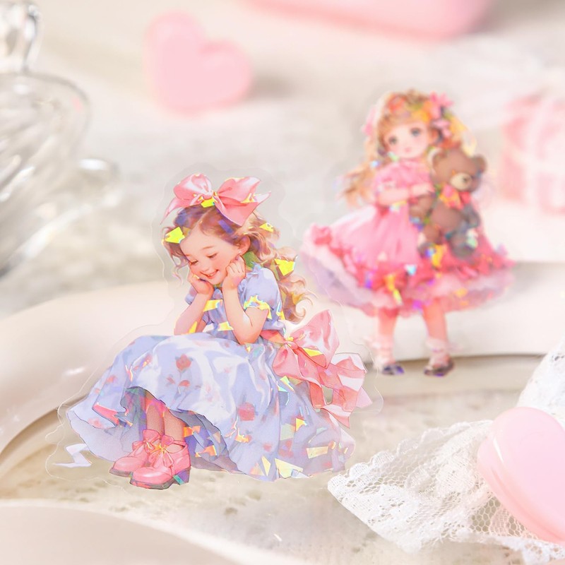 アニメ風のPET素材のシールセットです。貝殻光沢が付いて、角度によるキラキラと光るのが素敵ですね。様々な女の子のイラストデザインがかわいくて、どれを使うか悩んでしまいそうです。