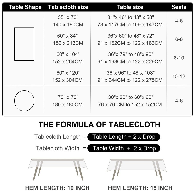 - Size guide: Please measure the size of the table carefully before buying a waterproof tablecloth. Further information can be found in the size chart to choose the tablecloths that suit you. Any size and quality problems, please feel free to contact us.