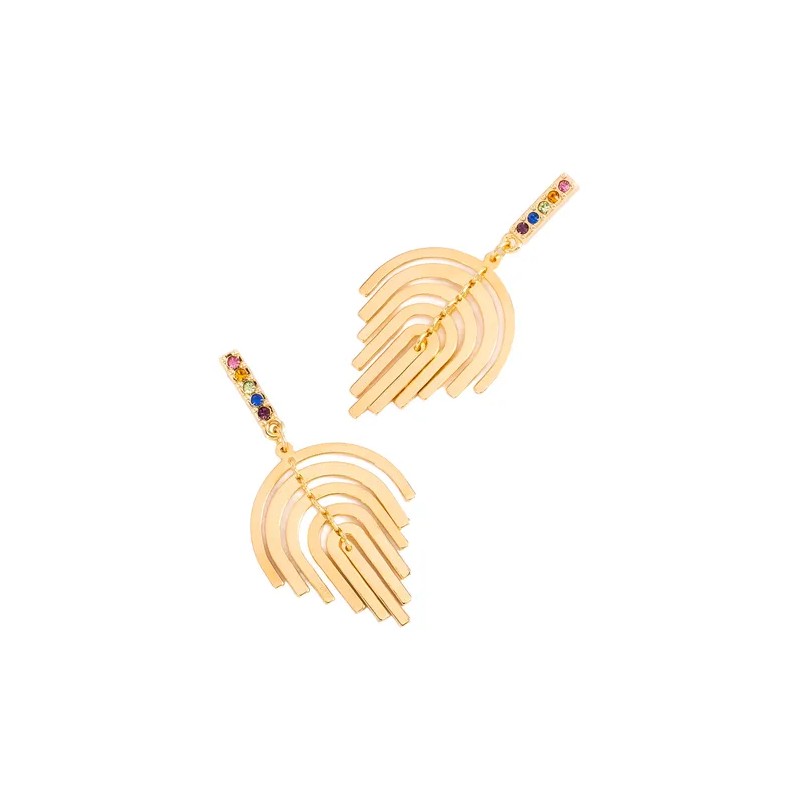 Aretes en baño de oro con diseño geométrico y piedras en tonos rosa amarillo verde claro azul zafiro y morado, ideales para usar solos o en combinación. Versátiles y modernos, aportan un toque juvenil y sofisticado a cualquier look.