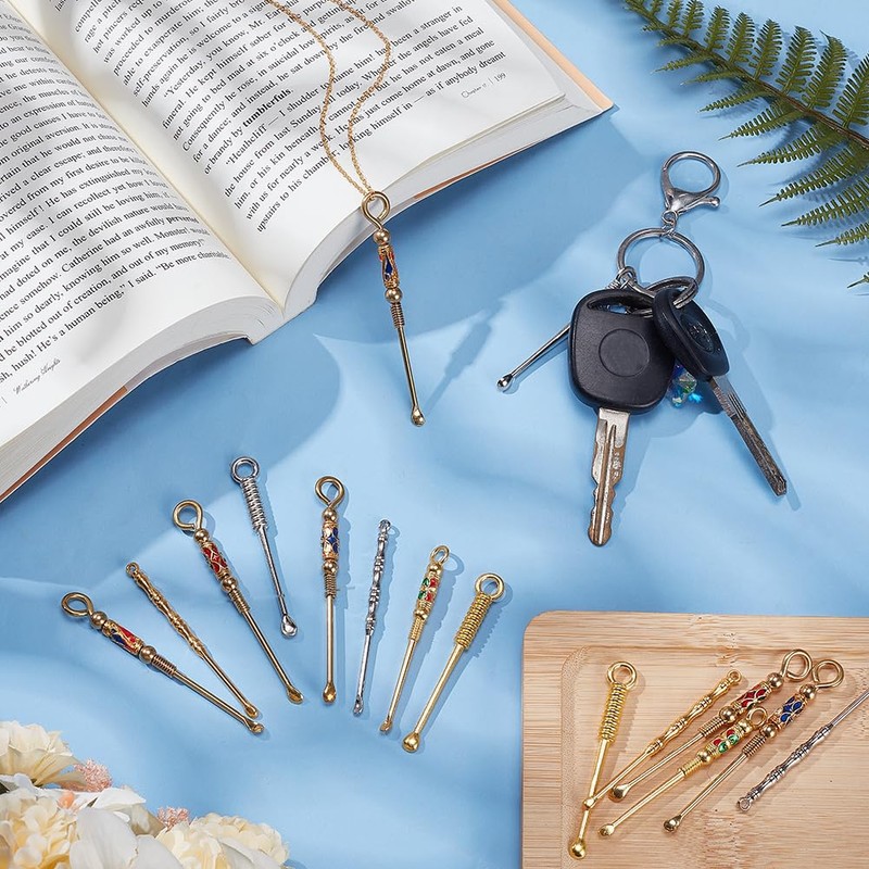 arricraft 16pcs Alloy Mini Ear Spoon Necklace Loop Pendant, 8 Styles Retro Brass Enamel EarPicks Portable Tiny Spoon Ear Cleaner with Key Ring for Keychain DIY Crafts
