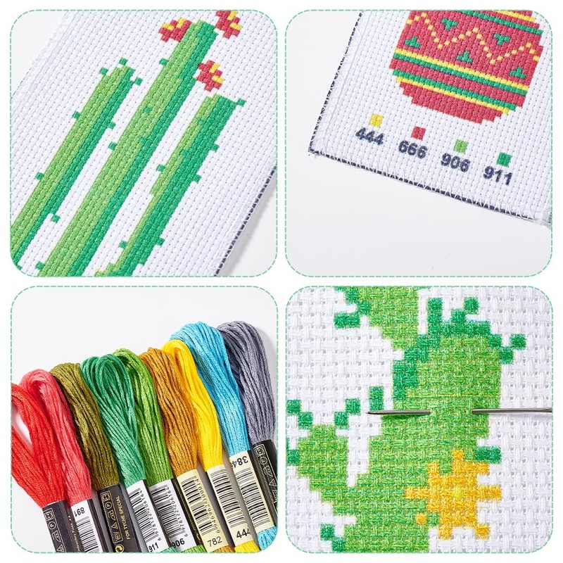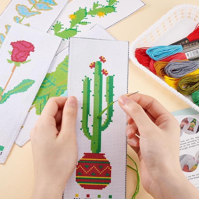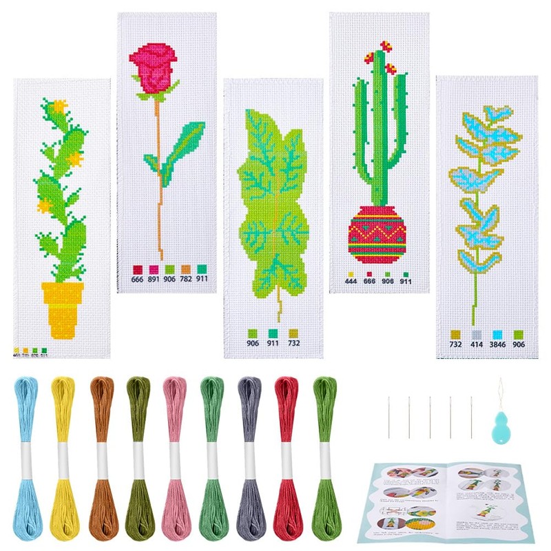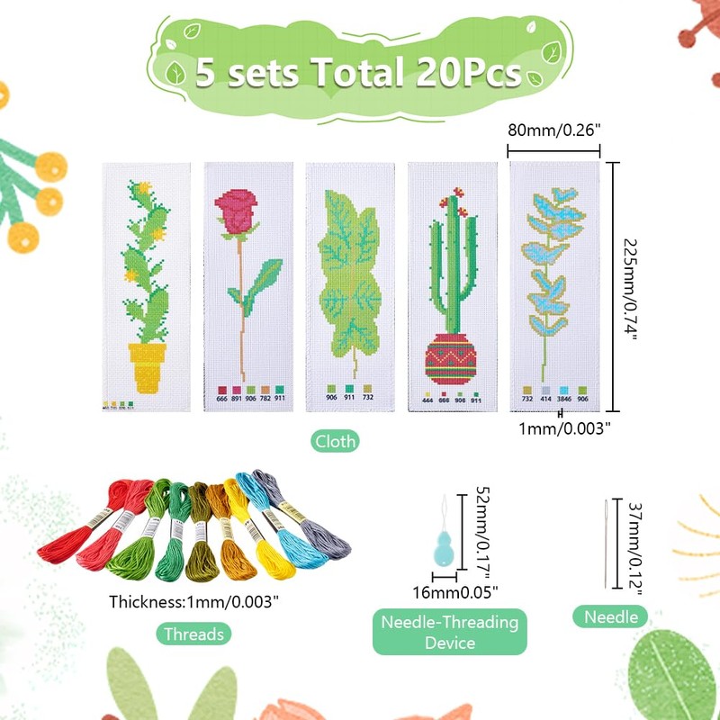 arricraft Set of 5 Cross Stitch Bookmark Sets with Plant Motif Stick Bookmark Set for DIY Stamped with Cactus Potted Plant Leaf with 9 Colour Threads Needles Cross Stitch Set