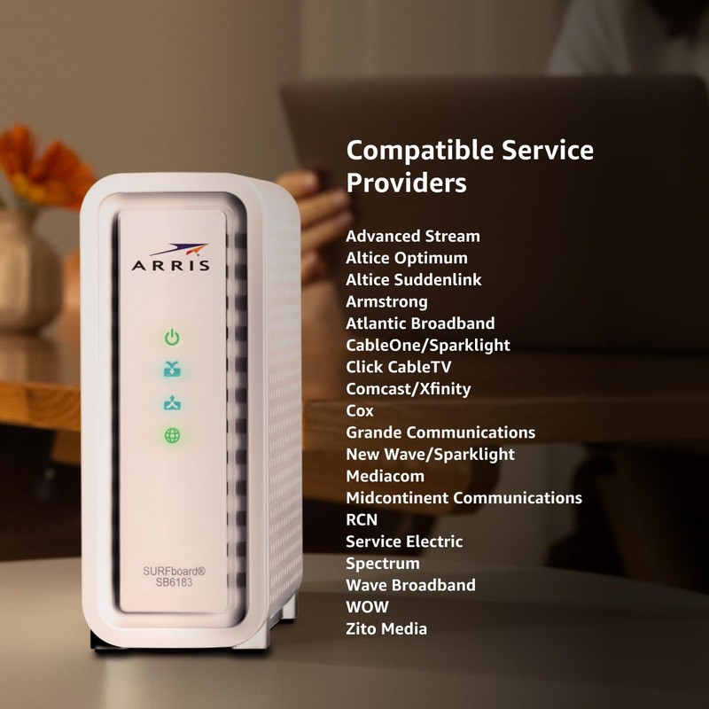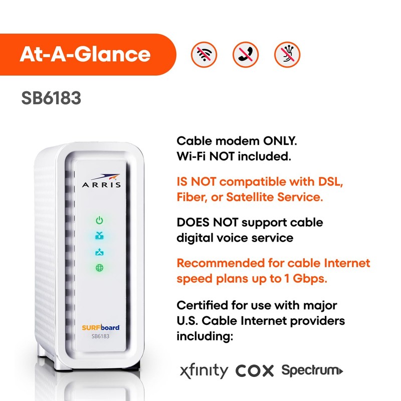 ARRIS (SB6183)-Cable Modem -Fast DOCSIS 3.0 16x4 Gigabit, For Comcast Xfinity, Cox,check with ISP for compatibility [Not for Spectrum],1 Gbps Port, 400 Mbps Max Internet Speed, 2 Year Warranty - White