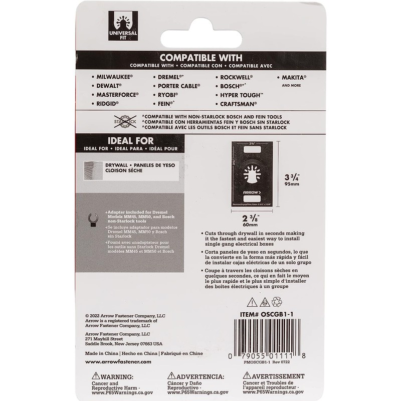 Arrow OSCGB1-1 1 Gang Electrical Box Drywall Cutting Blade for Oscillating Tools, Universal, Fits Most Multitools, Includes Adapter, Makes 2-7/8” by 3-3/4” Hole