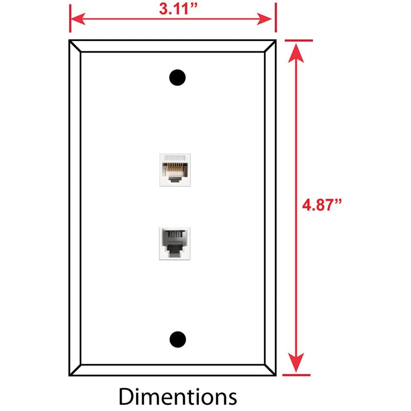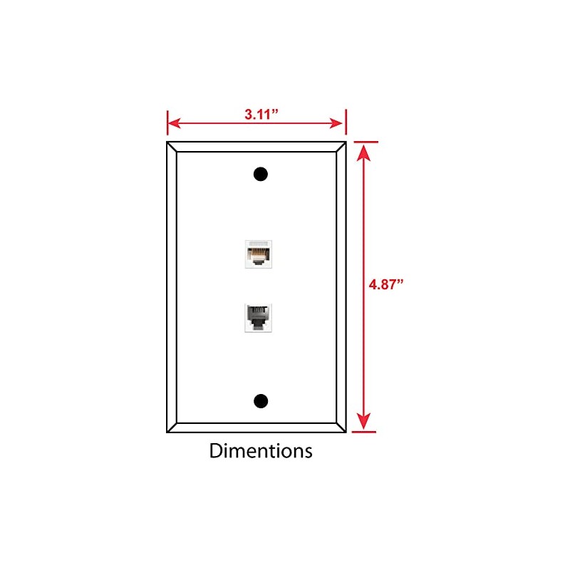 - Size: 4.87 x 3.11 - (Mid Size) 2 Port Data Wall Plate. One RJ11 telephone jack connector and one RJ45 Ethernet Jack. Both keystone connectors have Gold-Plated connections.