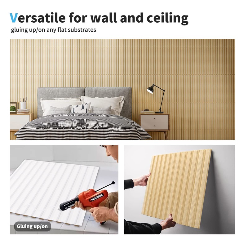 • INSTALLATION: Apply the adhesive (liquid nail is recommended) evenly on the back of each panel for installation, use a tile saw or a pair of "J" scissors.