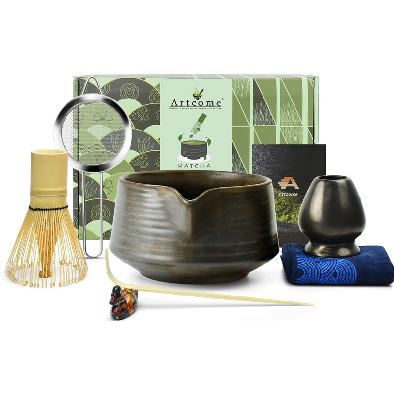 Artcome Matcha Tool Set - Complete Kit with Matcha Bowl with Spout, Bamboo Whisk, Tea Scoop, Whisk Holder, Scoop Holder, Tea Cloth & Powder Strainer, Antique Finish