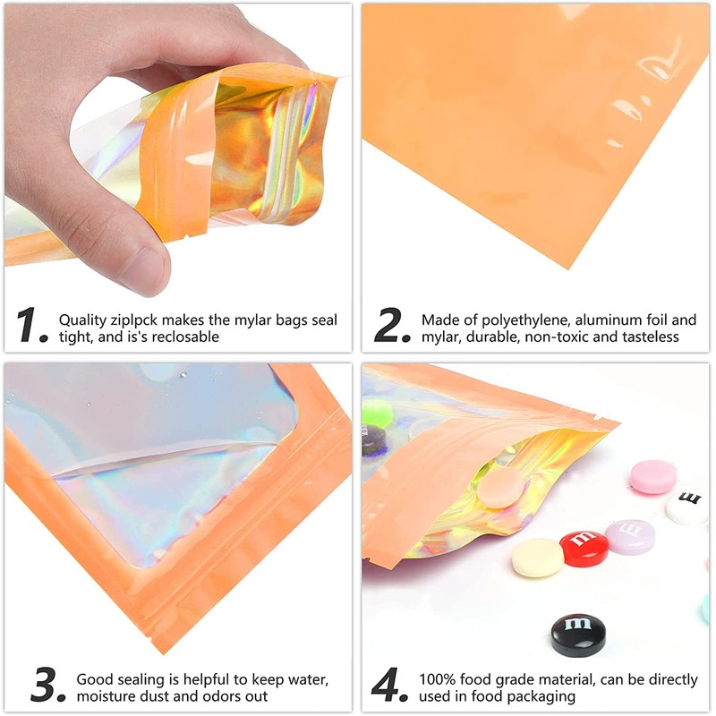 - 【HOLOGRAPHIC RAINBOW COLOR】Our foil ziplock bags come with holographic rainbow color in the back and transparent in the front in order to display the product clearly. When displayed indoors, you don't need to have lots of lighting to see the beautiful rainbow color