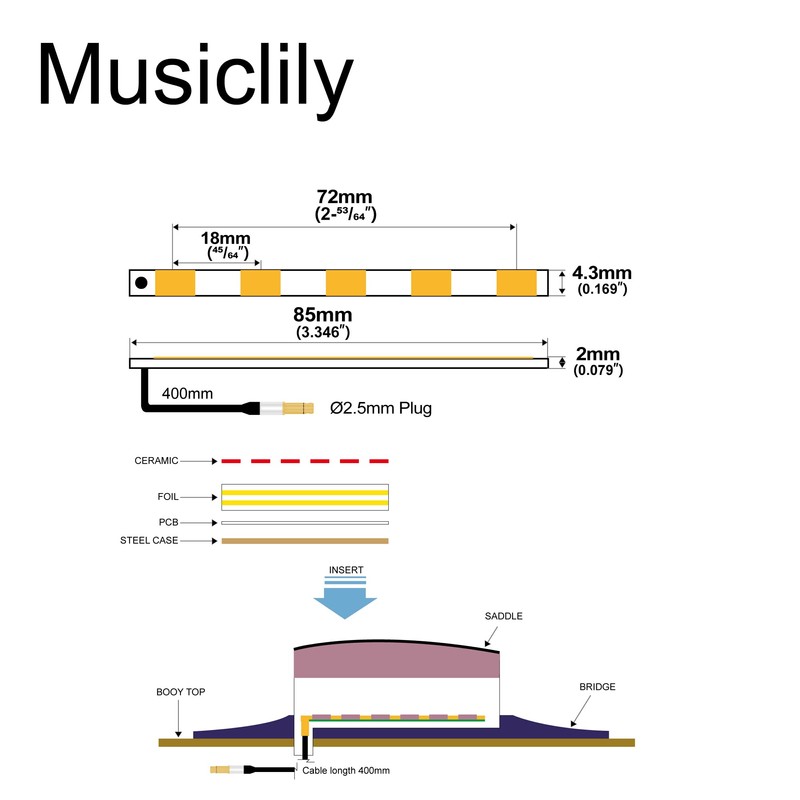 - Installed under the saddle, with no soldering required. Gold plated contact board and jack plug increase conductivity and reliability, Teflon shielded cable enhances stability and ease of installation, also ensures a virtually noiseless acoustic sound