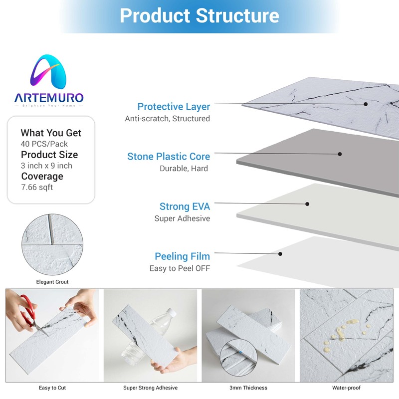 - **Top-Notch Material**: Made with high-quality Stone Plastic Composite material, Artemuro backsplash is tough, waterproof, anti-scratch, and feels premium. The structured soft glossy finish feels soft enough, looks like real marble, adding a touch of class to your kitchen or bathroom.
