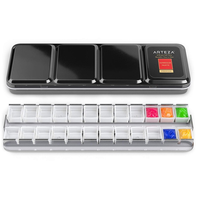 Personalize Your Paint Palette Create your own palette with this empty watercolor tin that includes 24 half pans. This versatile watercolor paint box includes removable and refillable half pans that are separated and locked securely into place. Each half pan sits inside the lightweight tin with a secure lid to keep your paints clean and dry. Fill each pan with the color and paint of your choice.