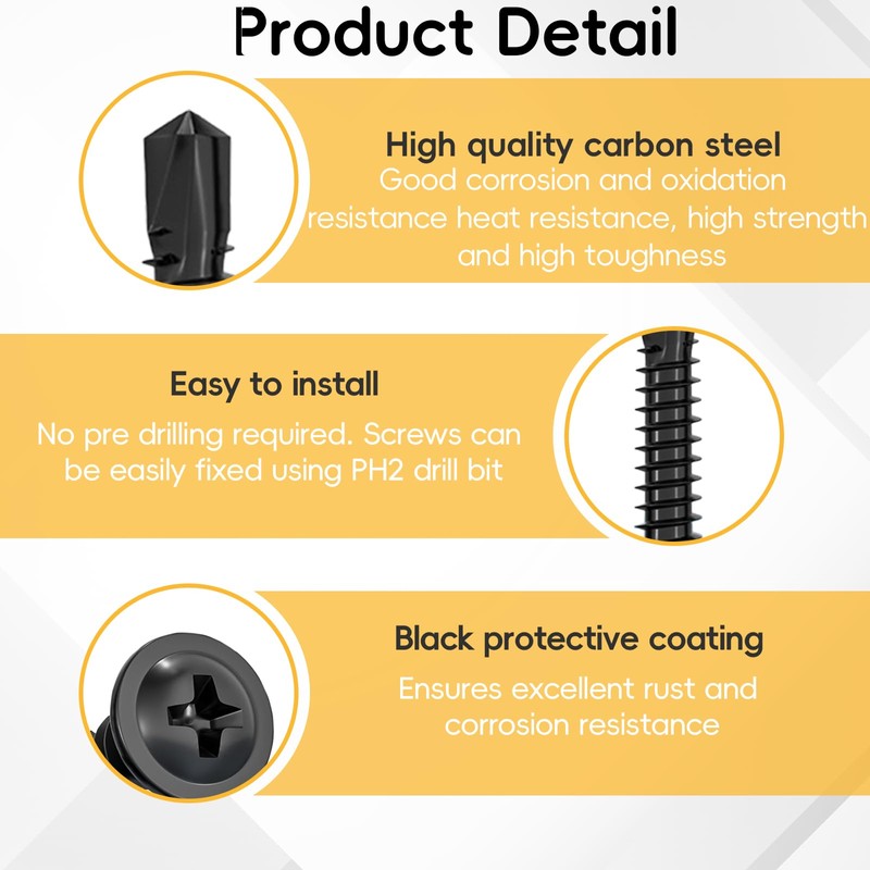 - Easy Installation Our black self tapping screws are easy to install. The precise fine thread ensures excellent pull-out strength, and the included PH2 drill bit allows for quick and easy installation of your screws. For a stable connection without breaking off the head