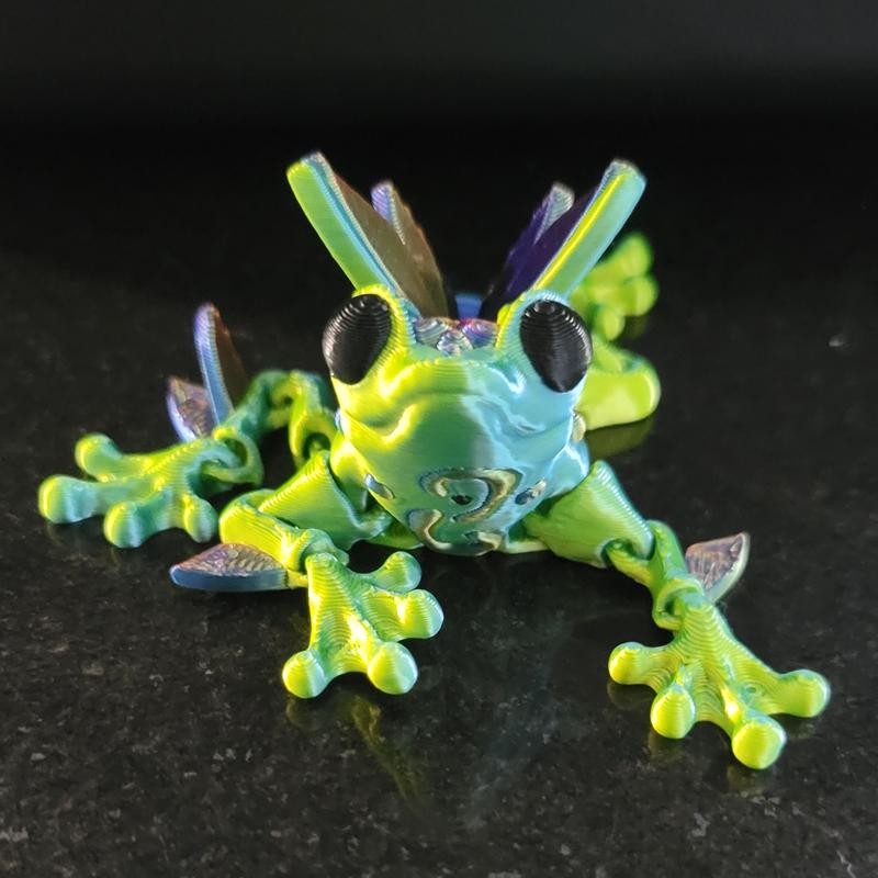 Colorful 3d Printed winged Frog made with various multi color filaments.