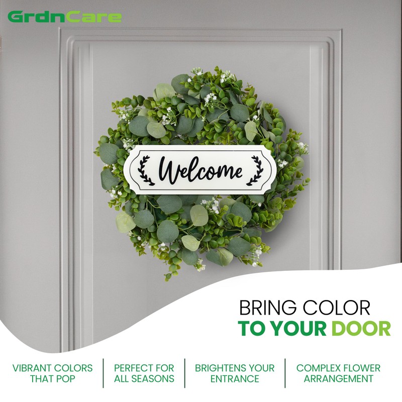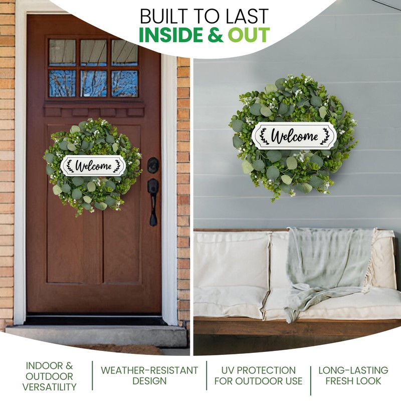 Artificial Eucalyptus Leaf Welcome Wreath for Front Door - Faux 18 Inch Front Door Wreath with White Welcome Sign for Front Door, Outside Wall, Window, Outdoor Party, Holidays
