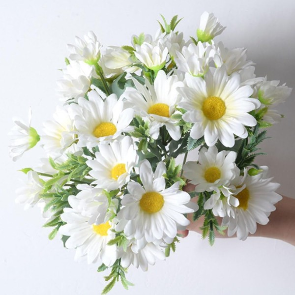- Material: The heads and leaves of artificial daisy flowers are made of silk cloth, and the stem is plastic outside and iron wire inside. You can cut and bend it easily. The whole bouquet is made of healthy, green and environmentally friendly materials.
