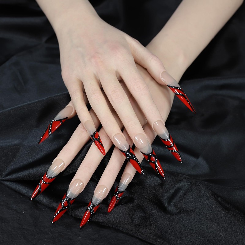 ArtiPrint Press on Nails Bold Vintage Glamour Style Semi-Transparent Nude Base with Red & Black Accent Design Reusable Stick-On Nails, Easy to Apply (K011, L)